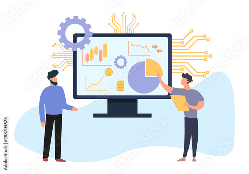 Obrovský tenis scoreboard a mikro mužské postavy hráči soutěžící hrát hru, Vektorové ilustrace. Tenisový šampionát, turnajový koncept pro webový banner, webovou stránku atd.