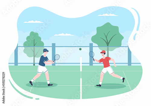 Tenisový turnaj, výcvik, vektorová webová šablona banneru. Dvě dívky hrají tenis na kurtu, retro plochý styl designu ilustrace. Raketový sportovní koncept.