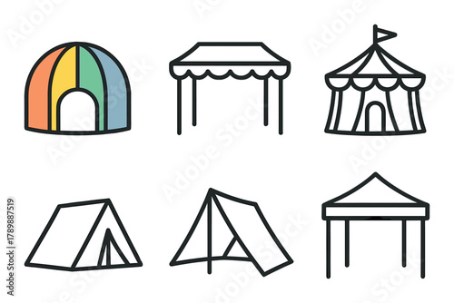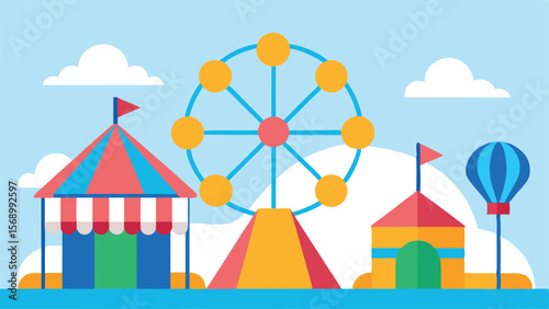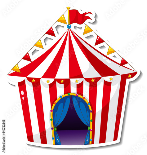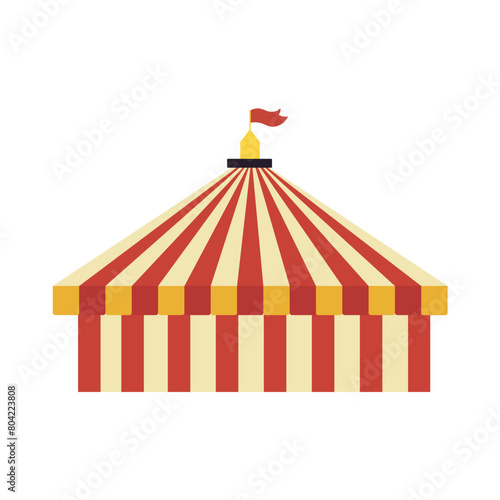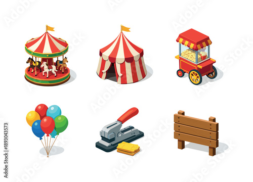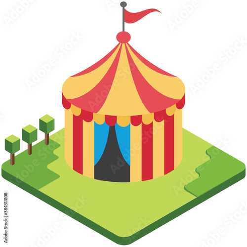 Stan pro cirkusové karnevalové akce, party a park Lunapark vektor. Fair nebo cirque pruhované marquee s vlajkou na vrcholu a balónky izometrické ilustrace izolovaných na bílém pozadí