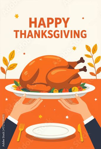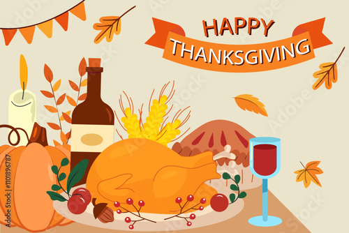 Den díkůvzdání vektorové ploché ilustrace. Tradiční pečená krůta, víno, javorové listy, žaludy, hojnost s dýní, kukuřičné klasy, jablko. Šťastný Den díkůvzdání koncept pro web banner webové stránky