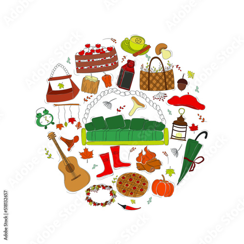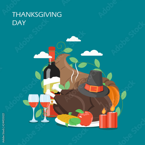 Den díkůvzdání vektorové ploché ilustrace. Tradiční pečená krůta, červené víno, hojnost s dýní, kukuřičné klasy, jablko, svíčky, pánský klobouk. Šťastný Den díkůvzdání koncept pro web banner webové stránky