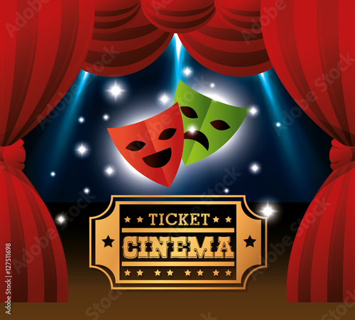 Divadelní festival vektorové plakát šablony. Realistická dřevěná divadelní scéna s červenými závěsy a divadelními tragédiemi a komediálními maskami, sedadla pro diváky. Pódium pro koncert, film, tanec a další show.