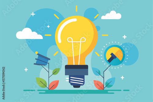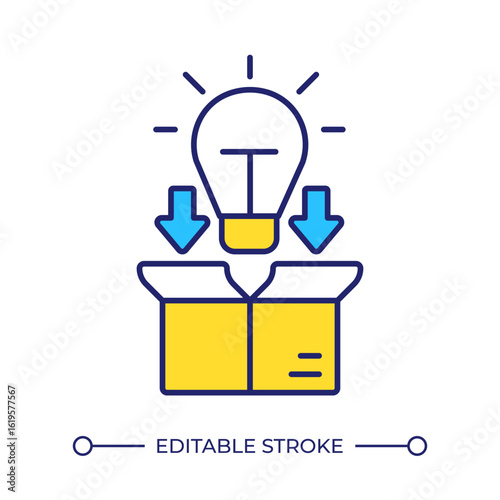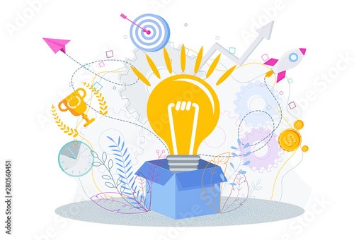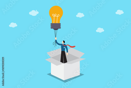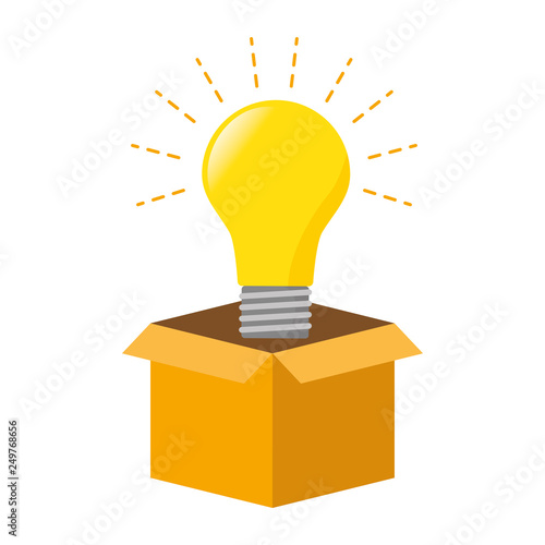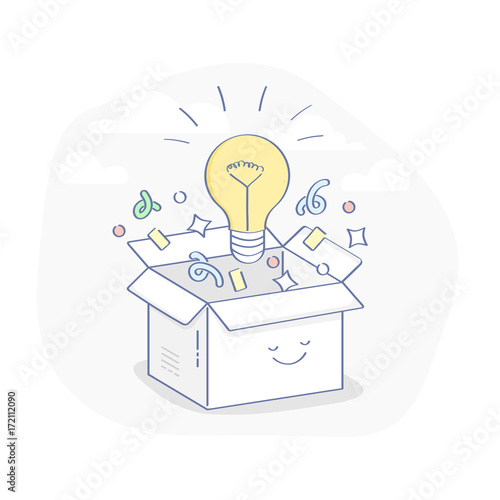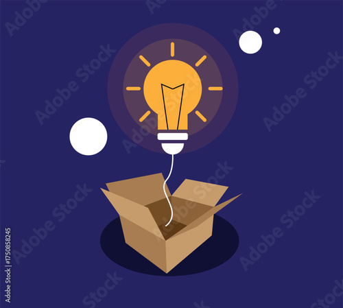 Myšlení po vybalení z krabice koncept pozadí. Žárovka se objevuje z kartonového obalu a symbolizuje nový kreativní nápad. Vektorová ilustrace v designu plochého stylu.