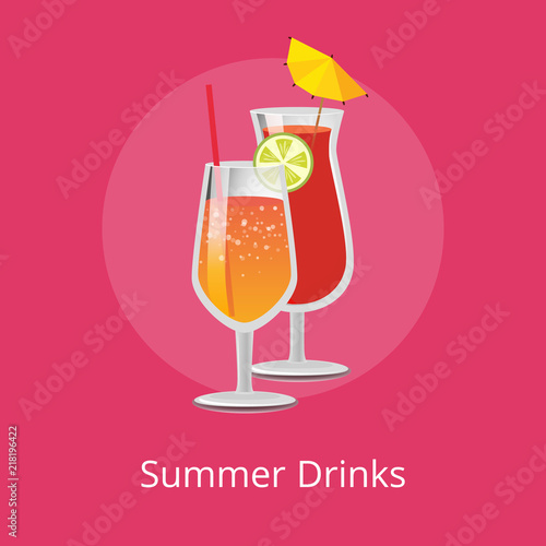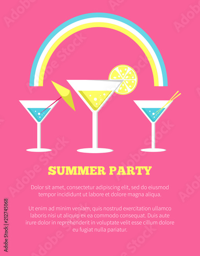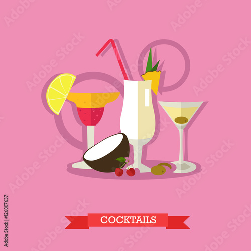 Vektorová ilustrace tří sklenic alkoholických koktejlů s tropickým ovocem. Oblíbené alkoholické nápoje, Margarita, Pina colada a suché Martini. Plochý design