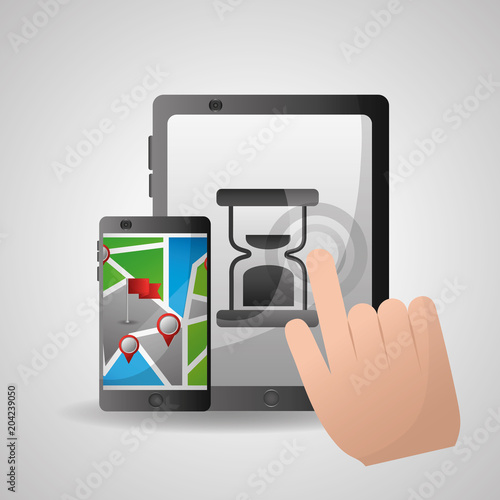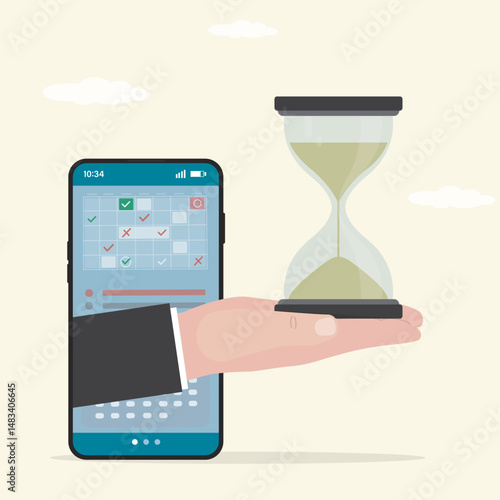 Čas jsou peníze. Smartphone se statistikou graf graf, písek hodiny, lidská ruka drží bankovní kreditní karty 3D vektorové ilustrace. Obchod a marketing. Produktivita práce