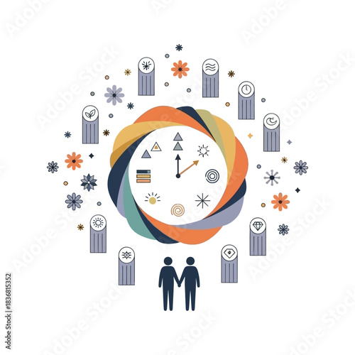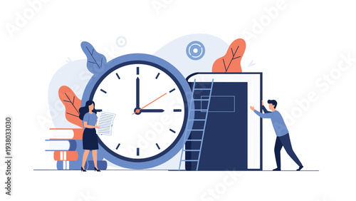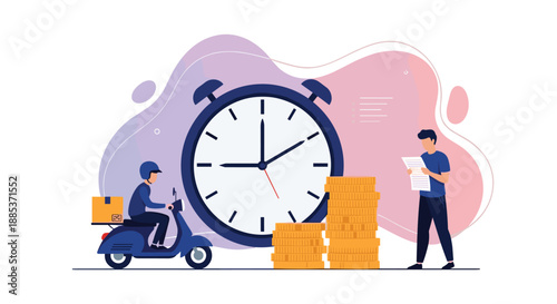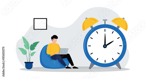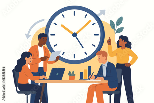 Vektorová ilustrace velkého monitoru počítače s mužem sedícím na hodinové ruce, zaměstnanci zabývající se jejich prací. Aplikace pro správu produktivity a času, koncept termínů pro webový banner, webová stránka.