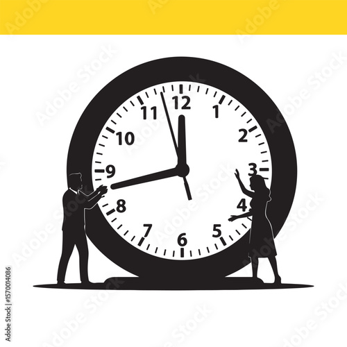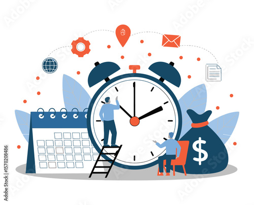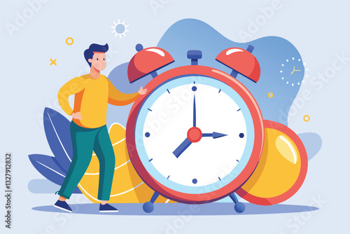 Vektorová ilustrace velkých hodin a muže, který drží ruku s hodinami při kávě. Řízení času, proces plánování a organizace pracovní doby, termíny termínů pro webový banner, webové stránky.