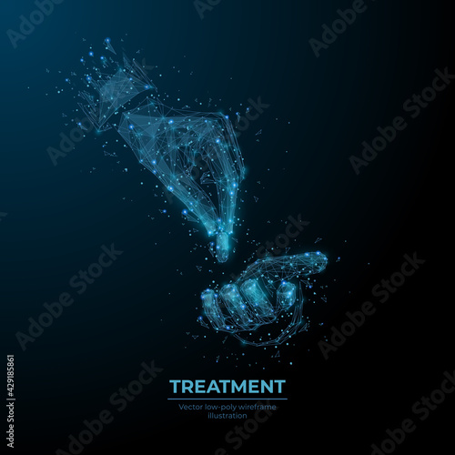 Vektorové polygonální umění styl lidská ruka naklápěcí přesýpací hodiny. Nízké poly drátěné pletivo s rozptýlenými částicemi, zlatým prachem a světelnými efekty na tmavém pozadí. Šablona banneru pro správu času.