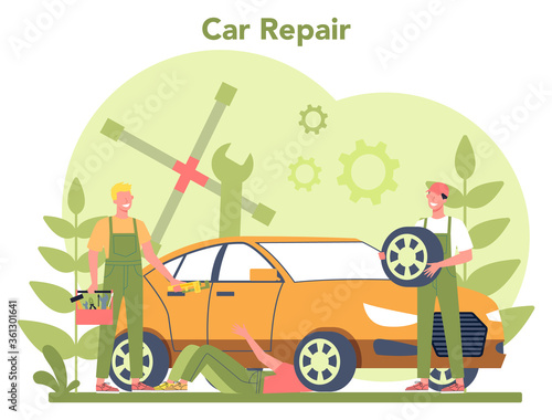 Autoservis, Autoservis, garáž. Automechanici montáž nové a měnící se staré pneumatiky, vektorový plochý styl designu ilustrace. Výměna pneumatik a auto služby.