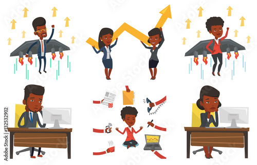 Unavená a veselá ženská postava v pracovní scéně. Vyčerpaný a energický pracovník kreslený vektorové ilustrace