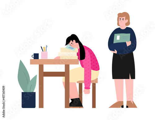Mladý muž spí, zatímco sedí u stolu v kanceláři, ploché vektorové ilustrace. Ospalý zaměstnanec kreslená postavička, unavený administrativní pracovník.