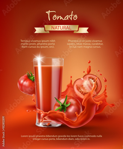 Reklamy na kečup z rajčat. Vektorové realistické ilustrace rajčatový kečup skleněné láhve balení maketa, čerstvé a zralé rajčata, rajčatová šťáva šplouchá.