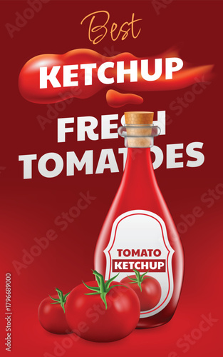Rajčatový kečup reklamní plakát šablona, vektorové ilustrace. Realistické balení kečupu skleněná láhev maketa, létající čerstvá a zralá rajčata, vidlička s chutnou klobásou.