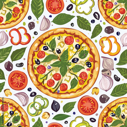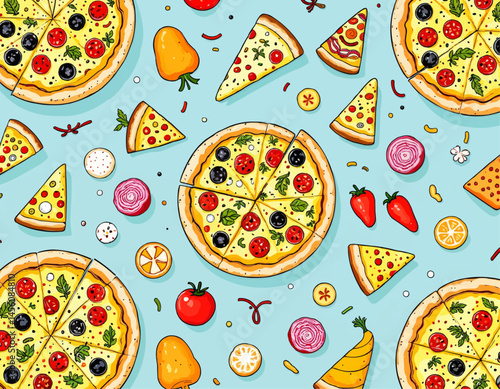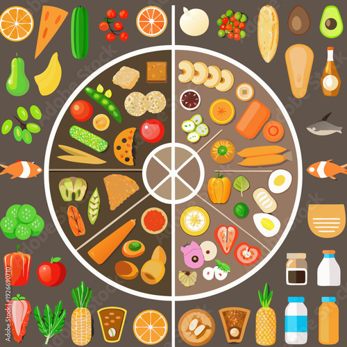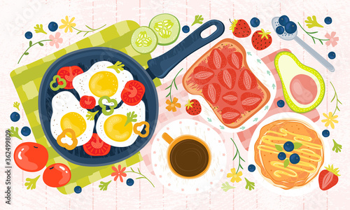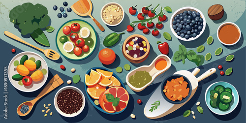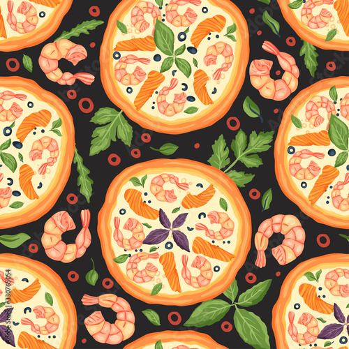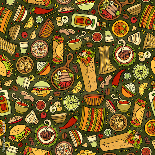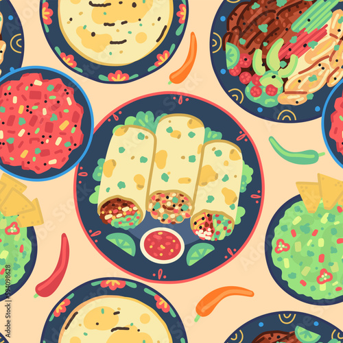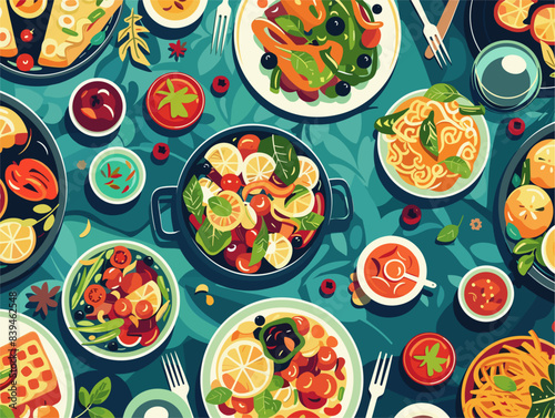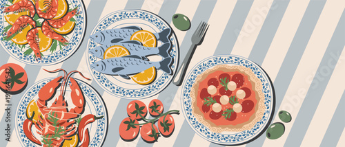 Pohled shora tabulka s středomořské potraviny bezešvé vzor. Vektorová ručně kreslená ilustrace. Zdravé jídlo, jídla s rybami, salátem a zeleninou.