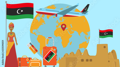 Tour agentura reklamní plakát banner. Vektorová plochá ilustrace. Hora, kite, táborák, stan, batoh, dolarové mince a láhev na zapalovač na uhlí. Camping Příroda cestovní ruch koncept.