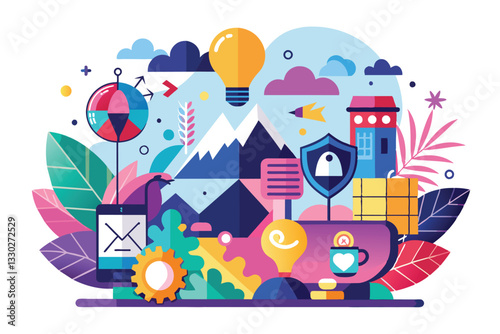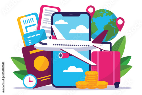 Tour agentura reklamní plakát banner. Vektorová plochá ilustrace. Hora, drak, táborák, stan, batoh, dolarové mince, ruční držení zapalovače na uhlí láhev tekutiny. Camping turistika trekking koncept.