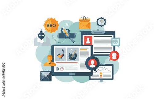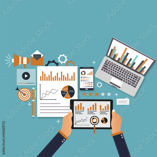Plakát cestovní kanceláře. Vektorová plochá ilustrace. Globe, smartphone, letenky, taška s pasem a penězi, notebook s pinem na mapě světa na obrazovce, ruční fotoaparát. Cesta po celém světě