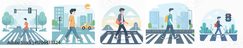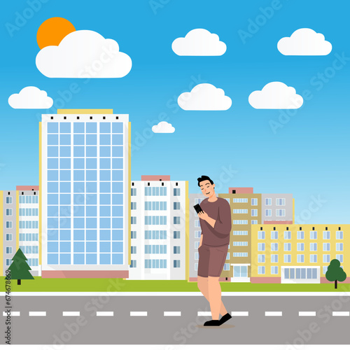 Turistická mužská postava cestující po městě s kamerou, plochá vektorová ilustrace. Šťastný muž jde na prohlídku. Cestovatel chodí na ulici s batohem. Cestovatel Bloger, fotograf.