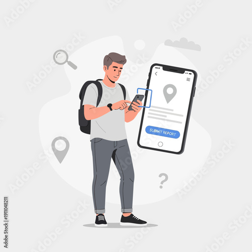 Vektorová ilustrace cestujícího muže s batohem a mapou. Turističtí lidé koncept plochý styl designový prvek, ikona izolované na bílém pozadí.