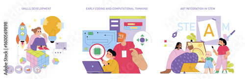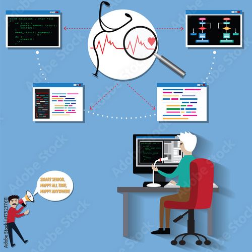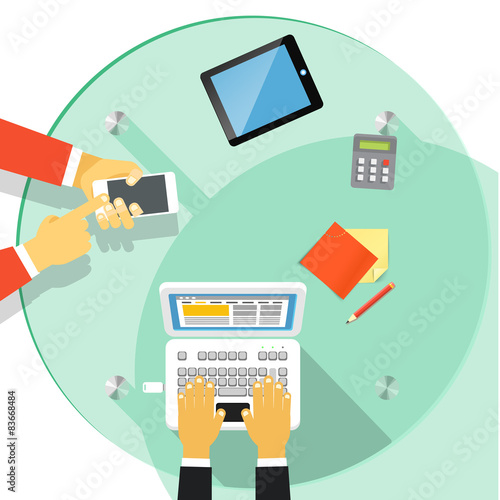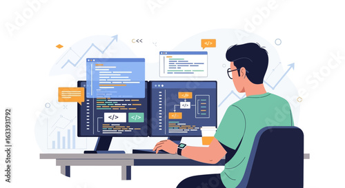 Úspěšný podnikatel, obchodník při pohledu na počítačové monitory, zatímco sedí u obchodníka stolu se zdviženýma rukama, ploché vektorové ilustrace. Akciový trh, investice a obchodování.