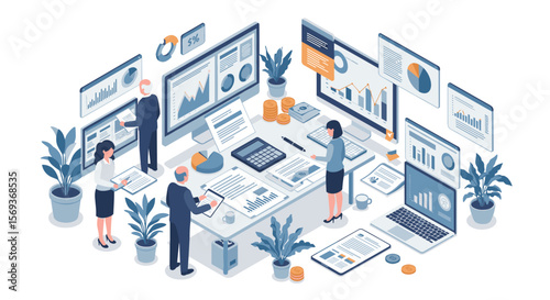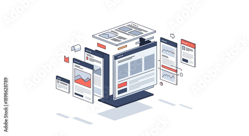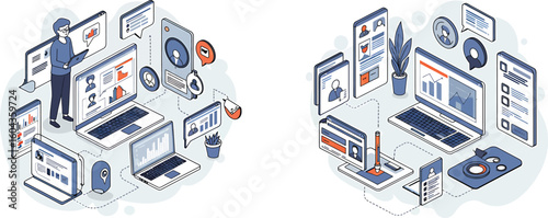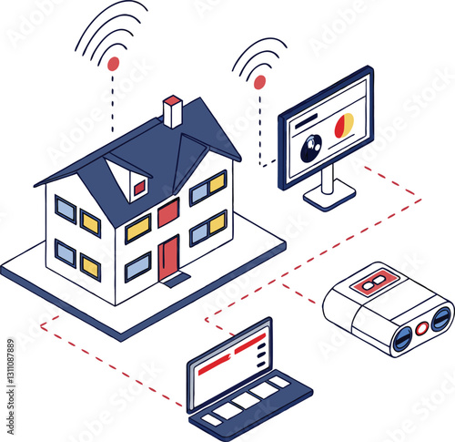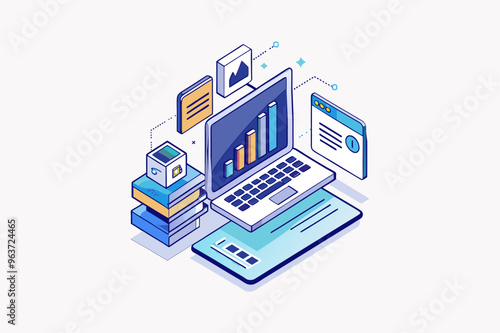 Trailer online vektorové ilustrace. Izometrický 3D obytný vůz nebo obytný vůz k prodeji nebo pronájmu na klávesnici notebooku. Online nakupování, E-commerce koncept designové prvky izolované na bílém pozadí.