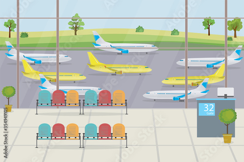 Interiér vlaku s pohodlnými sedadly, oknem a stolem plochý kreslený vektorový ilustrační set. Metro, metro železnice dojíždět veřejnou dopravou