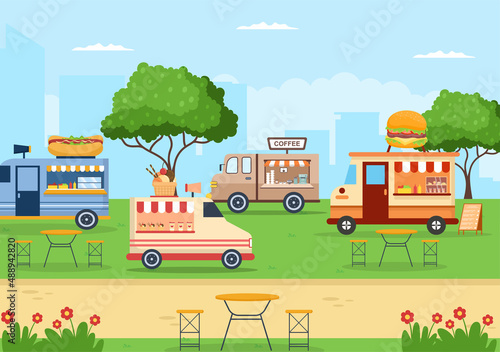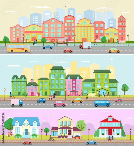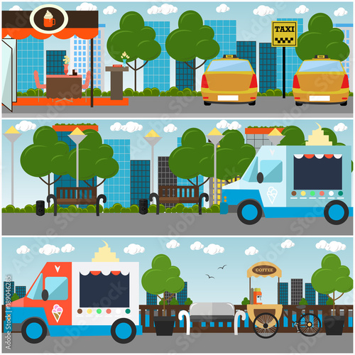 Vektorová sada venkovních tréninkových interiérových plakátů, bannerů. Nábřeží Panoráma města s chodníkem, cyklostezka, street food vozík, zmrzlina truck, lavičky a sportoviště v parku. Plochý design.