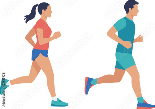 Vektorové ilustrace mladého muže a ženy jogging. Školení mimo lidi koncept plochý styl designový prvek, ikona izolován na bílém pozadí.