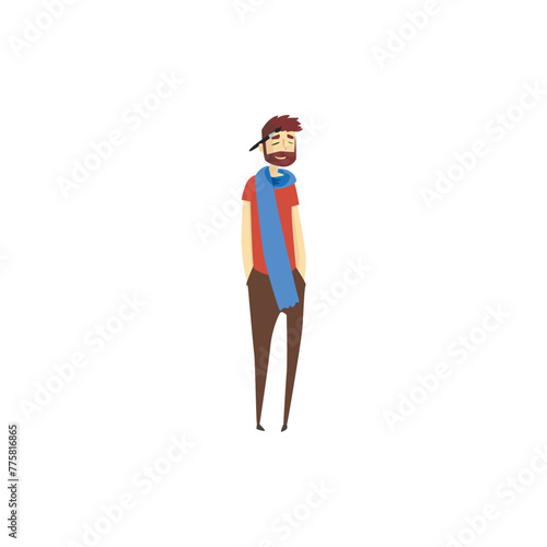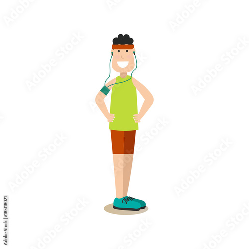 Vektorová ilustrace sportovce ve sluchátkách. Školení mimo lidi koncept plochý styl designový prvek, ikona izolován na bílém pozadí.
