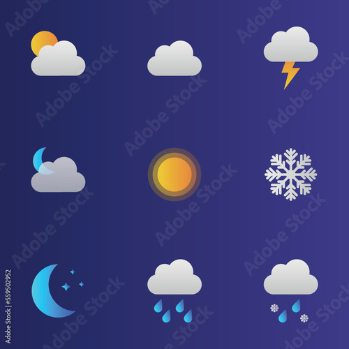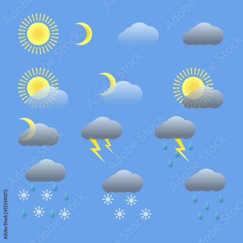 Ikona předpovědi počasí s mrakem, sluncem, sněhovými vločkami, dešťovými kapkami, blesky atd. Vektorové realistické ilustrace na průhledném pozadí.