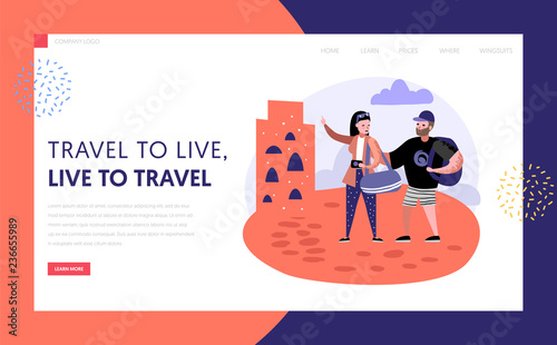 Cestovní a prázdninový koncept. Turisté s cestovním kufrem. Prázdniny. Vektor web design šablony. Vstupní stránka webové stránky ilustrace.