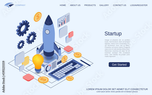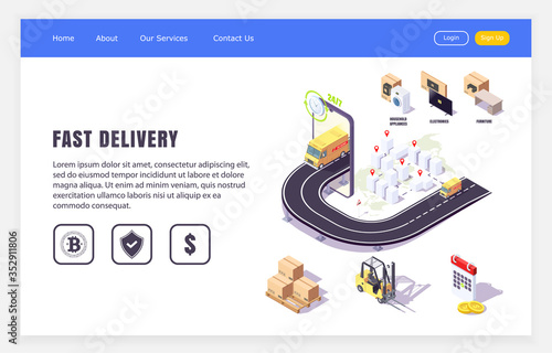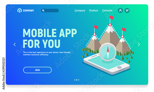 Aplikace pro cestovní banner, webová šablona. Vektorový izometrický smartphone s autem jedoucím po dálnici, lesy, značka mapy na vrcholu hory na obrazovce, kopírování prostoru, tlačítko Více informací.