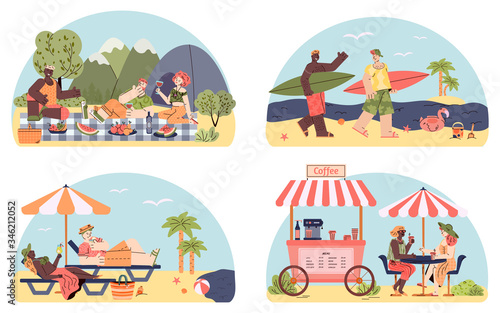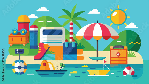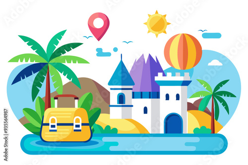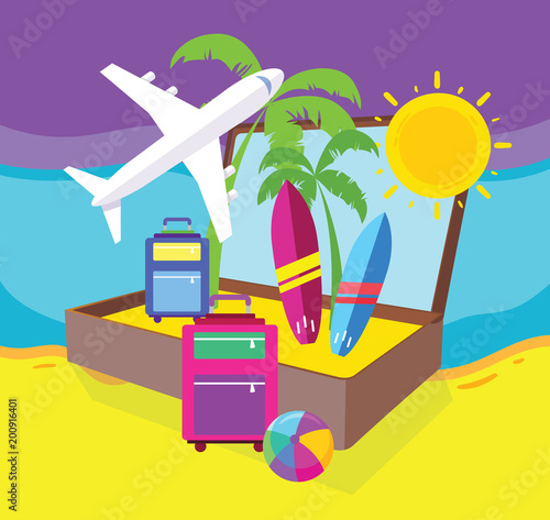 Cestovní koncept vektorová ilustrace v designu plochého stylu. Letadlo létající nad turisty zavazadla, loď, palmy, pláž. Dovolená a cestovní ruch pozadí.