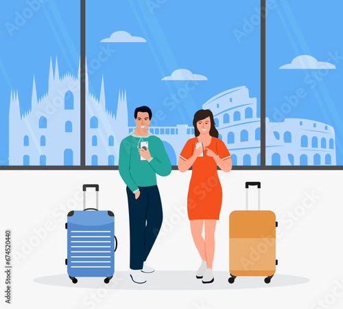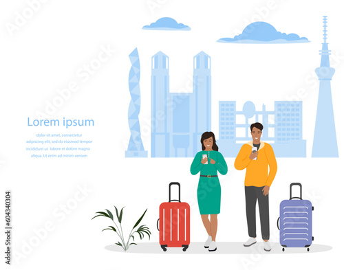 Cestovní pár zadní pohled, ploché vektorové ilustrace. muž a žena s cestovní taškou drželi se za ruce. Romantická dovolená, letní prázdniny, líbánky, cestování po světě.