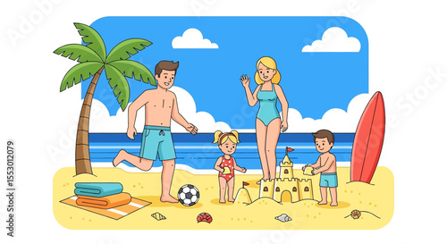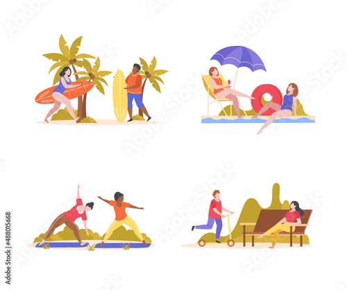Tropic vánoční párty u bazénu, ploché vektorové ilustrace. Šťastní lidé v Santa klobouky plavání v bazénu, tanec, pití piva a baví. Oslava Nového roku, tropická zimní dovolená.