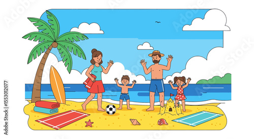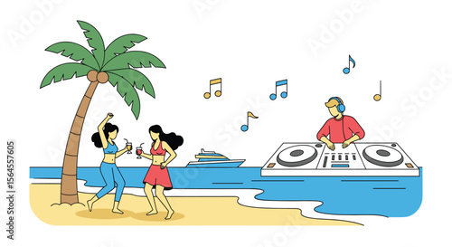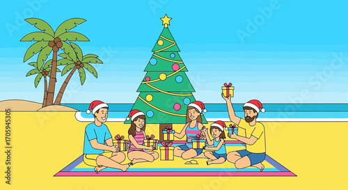 Tropic vánoční párty u bazénu, ploché vektorové ilustrace. Šťastní lidé v Santa klobouky plavání v bazénu, tanec, pití piva a baví. Oslava Nového roku, tropická zimní dovolená.