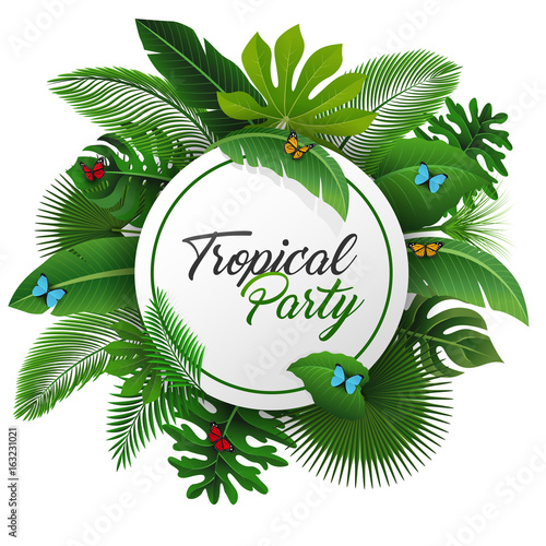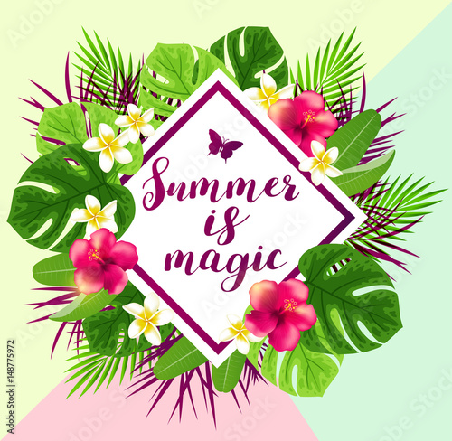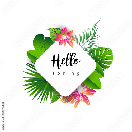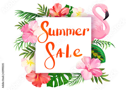 Tropický sen vektorový papír řezané ilustrace s tropickými květy, palmovými listy a růžovým plameňákem. Tropical beach summer travel concept designový prvek pro plakát banner atd.