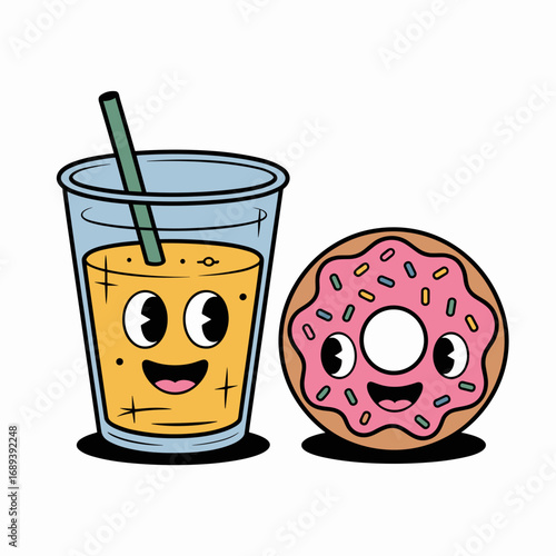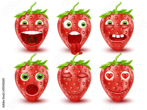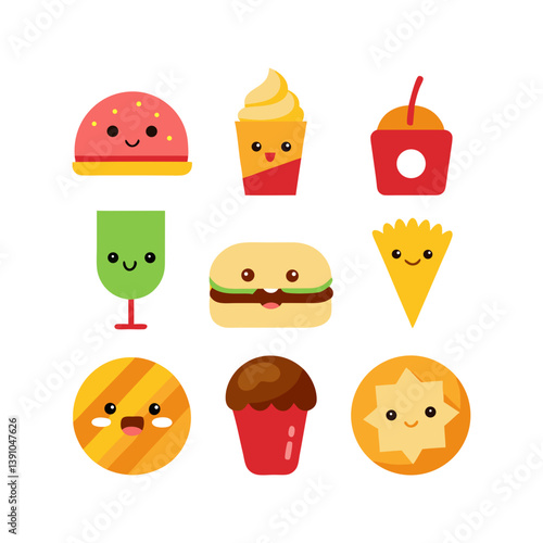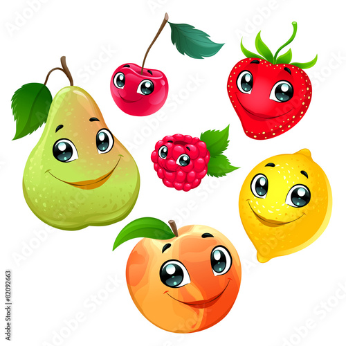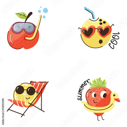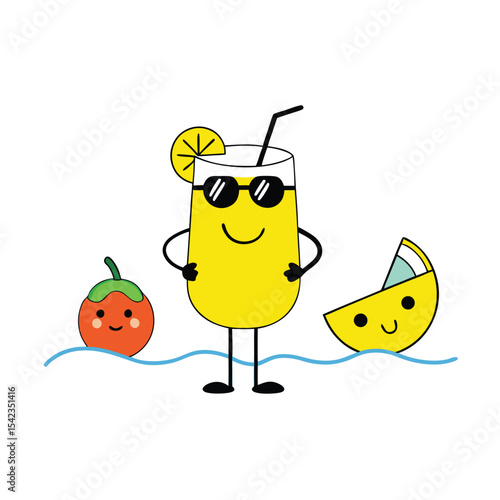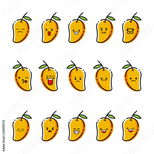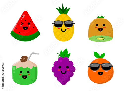 Tropické ovoce koktejl cartoon tvář ploché vektorové sady. Kawaii kreslená postavička ilustrace. Exotický nápoj ve sklenici se slámou a kusem ananasu, pomeranče a máty izolované na bílém