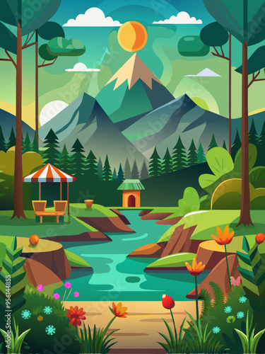 Tropická džungle Krajina, vektorové ilustrace v papírovém uměleckém stylu. Amazonská lesní scenérie se zeleným listím, exotickými rostlinami, vodopádem.