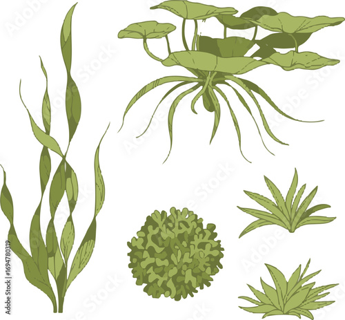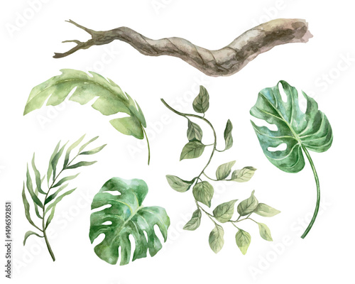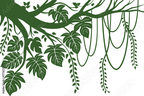 Tropické Liana liána rostlina dekorativní prvky set, plochý vektorové ilustrace izolovaných na bílém pozadí. Závěsné brunche z džungle, popínavé zelené rostliny, rám monstera.