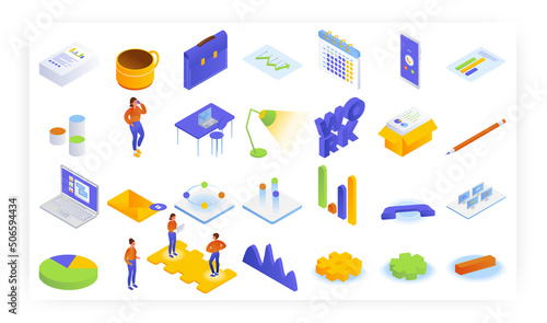 Produkce a vysílání zpráv, izometrická sada ikon, plochá vektorová izolovaná ilustrace. Pár sledování televizních zpráv sedí na pohovce. Moderátor hosting televizní program ve studiu.