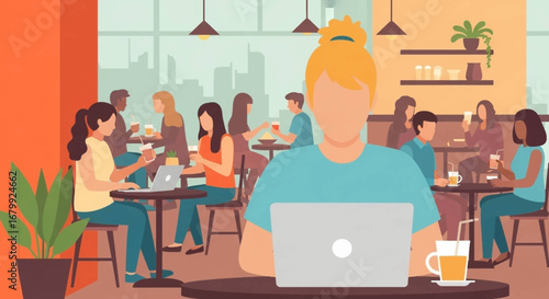 Dvoupodlažní coworkingové obchodní kancelářské centrum, plochá vektorová ilustrace. Moderní interiér coworkingového prostoru pro práci na volné noze, práci na dálku. Nezávislí pracovníci, kolegové pracující na počítačích, obchodní jednání