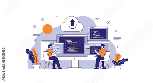 Typografické služby, vektorové ilustrace. Tiskový proces s obrovskými ofsetovými tiskárnami a mikro mužskými a ženskými postavami. Tiskárna složení pro web banner, webové stránky atd.