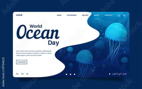 Vektorová šablona webových stránek podvodního světa, design vstupní stránky pro vývoj webových stránek a mobilních stránek. Vrstvený papír řez styl Podvodní moře oceán jeskyně, tropické exotické ryby, vodní rostliny.