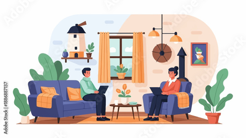 Mladá žena jíst nezdravé jídlo a pití vína, zatímco sedí na pohovce a sledování televize, vektorové ploché ilustrace. Rychlé občerstvení, nezdravé stravování a životní styl.