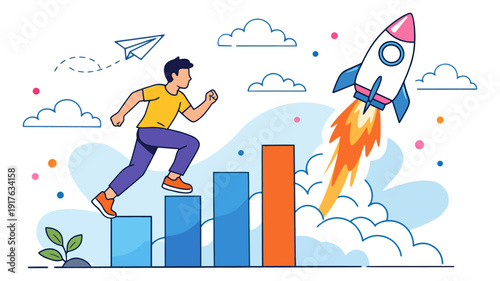 Úspěšný podnikatel, jednorožec kůň, raketa vzlétnout, ploché vektorové ilustrace. Jednorožec společnost nebo spuštění. Rizikový kapitál průmysl.