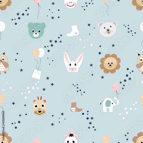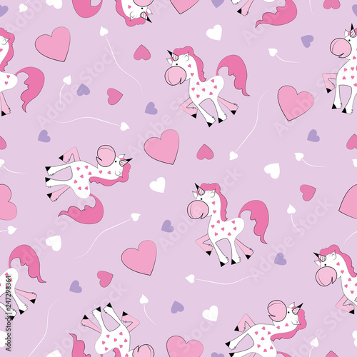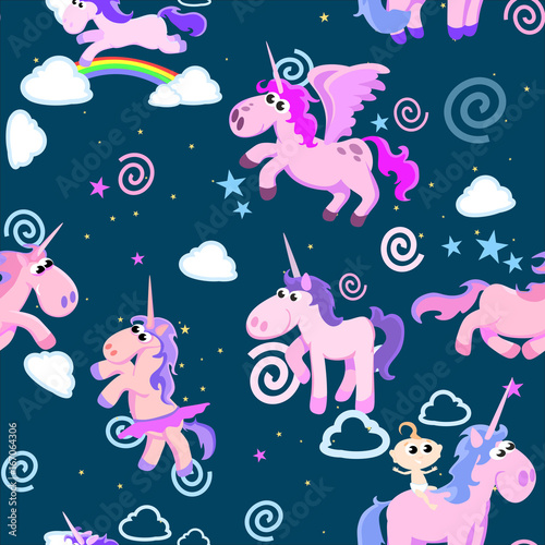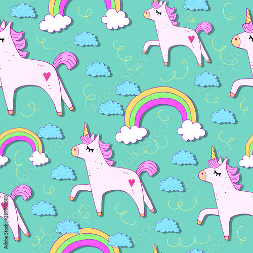 Magic unicorn bezešvé vzor. Vektorové ručně kreslené létání na balónech romantické jednorožce s duhy a mraky.