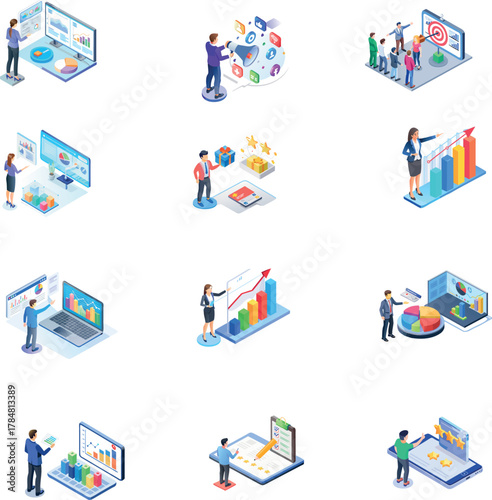 Nahrajte soubory do cloudového úložiště, organizujte věci, rychleji vyhledávejte fotografie a vytvářejte inteligentní alba, izometrické ilustrace plochého vektoru. Přenos souborů, služba rychlého vyhledávání obrázků. Online fotogalerie.
