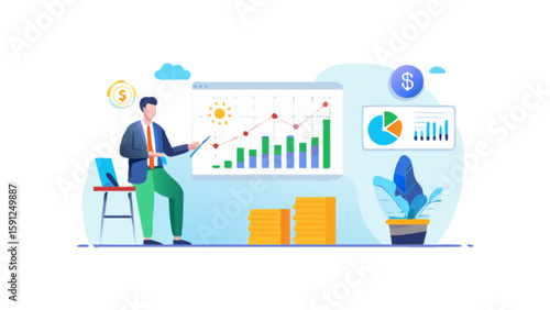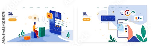 Použití dat vstupní stránky design, webové stránky banner šablona set, plochý vektor ilustrace. Podnikatel analyzuje data a dashboardy na mobilním telefonu. Business analytics Mobilní aplikace, finanční zpráva.