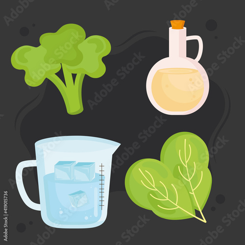 Užitečné tuky vektorové plochý styl designu ilustrace. Avokádo, rostlinný olej, hořká čokoláda, mandle, pistácie a arašídové máslo. Potraviny se zdravým složením tuků pro webový banner, webovou stránku atd.